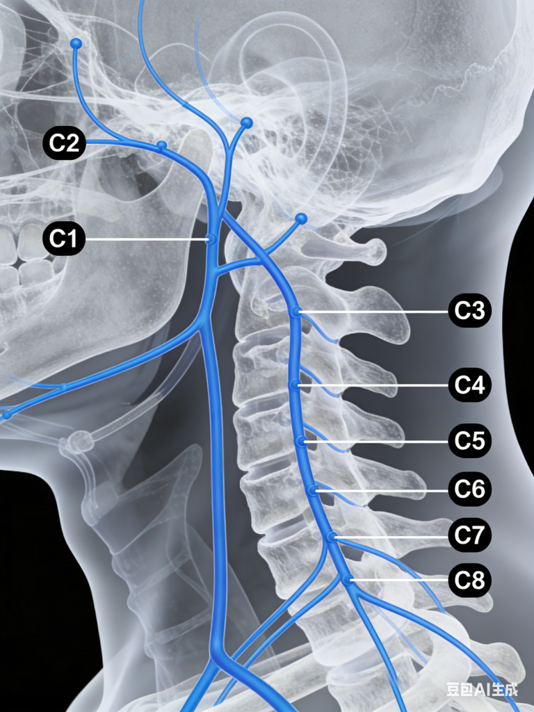 颈椎共有8对颈神经根,从C1至C8。这些神经根从脊髓发出,经椎间孔(相邻椎骨之间的小骨性开口)从椎管两侧穿出。这些颈神经会进一步分支,支配着你的肩部、手臂、手部和手指的肌肉,使其能够活动。它们还携带着感觉纤维至皮肤,提供感觉。